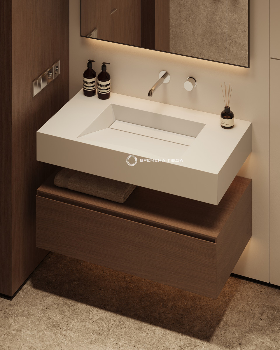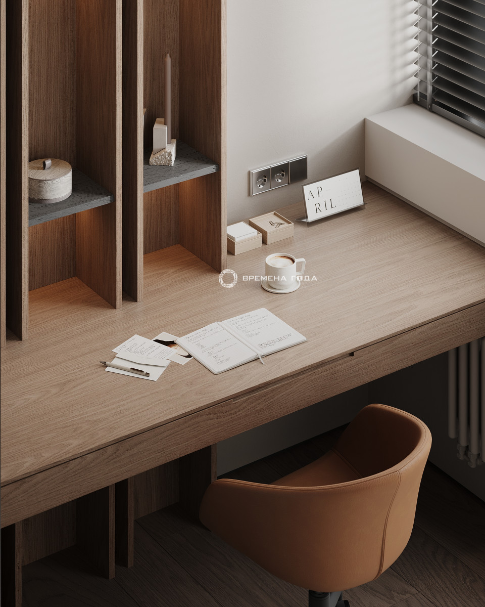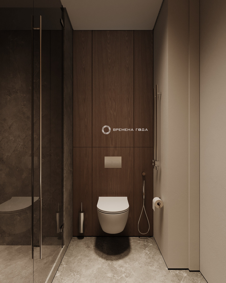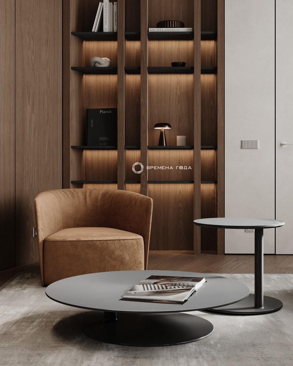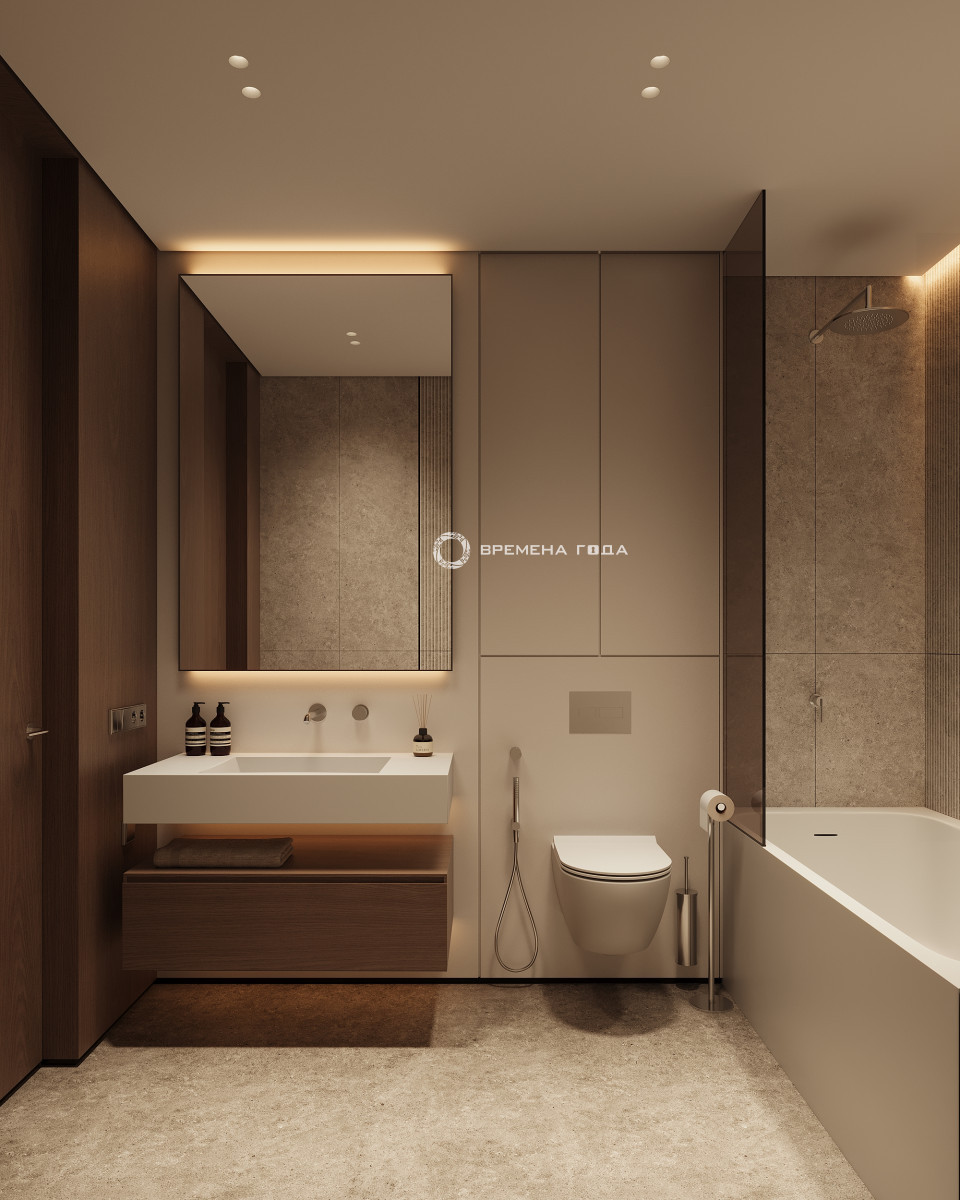 В квартире выполнена премиальная дизайнерская отделка с использованием высококачественных и натуральных материалов, таких как: натуральный мрамор, шпон дуба, сатинированная сталь, декоративная штукатурка.