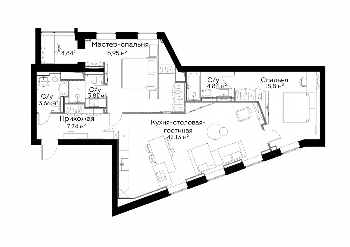 - Кухня гостиная с обеденной зоной (42.13 кв.м);
