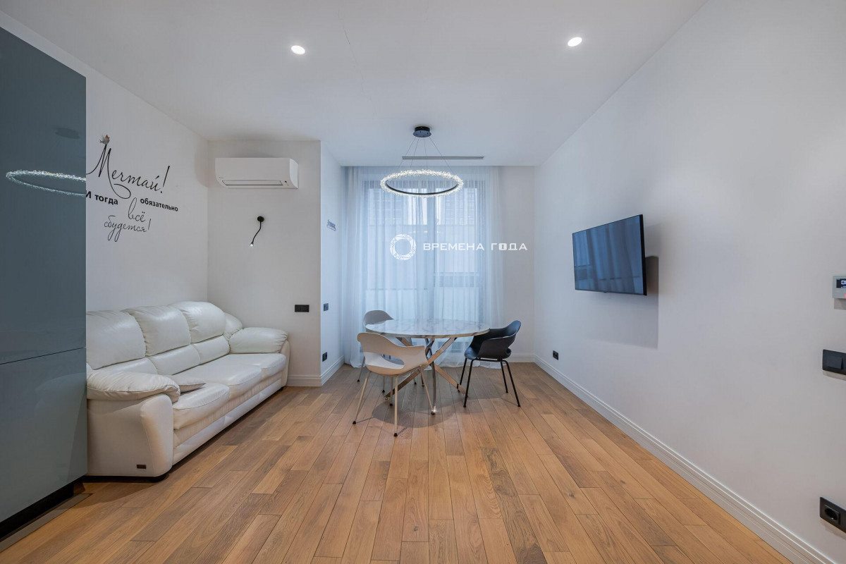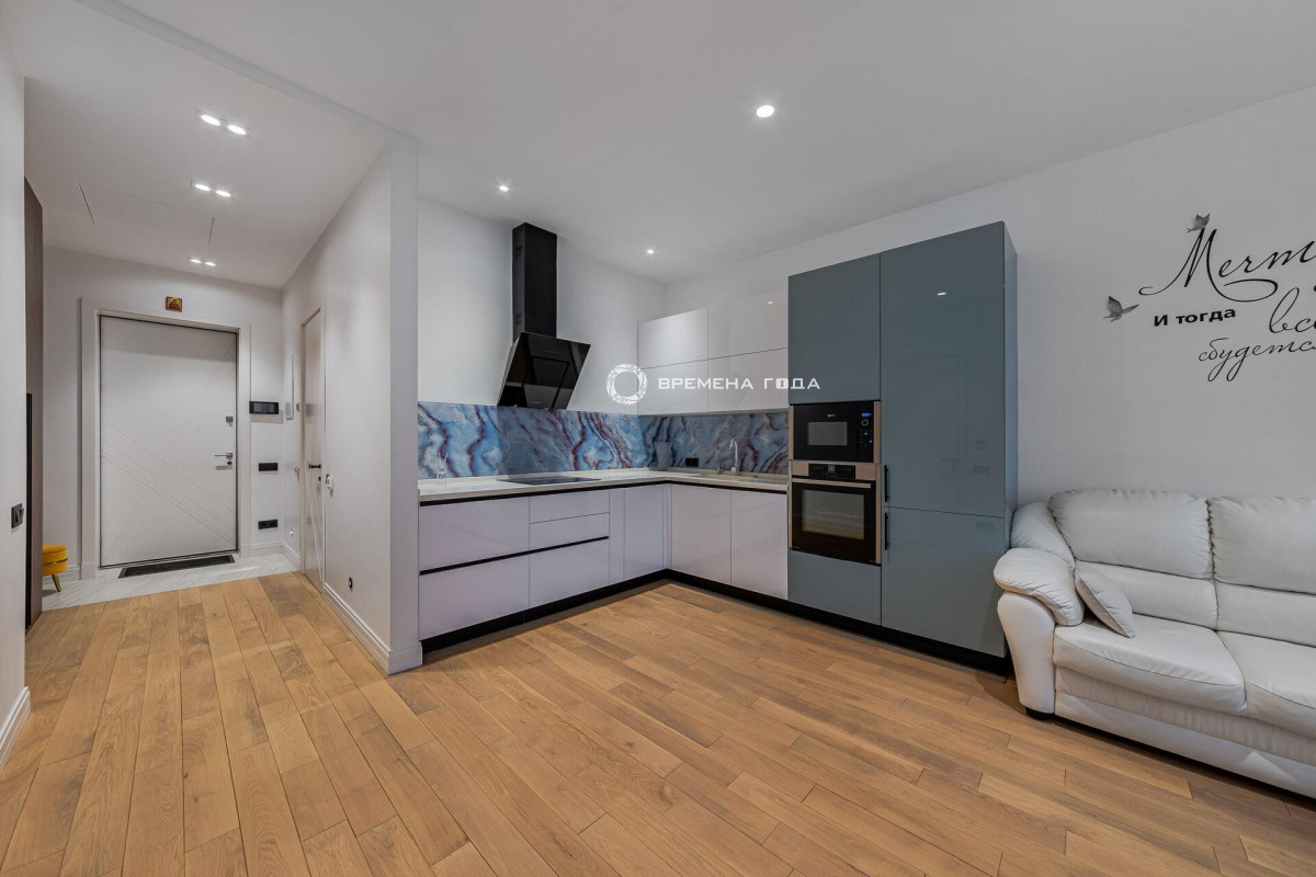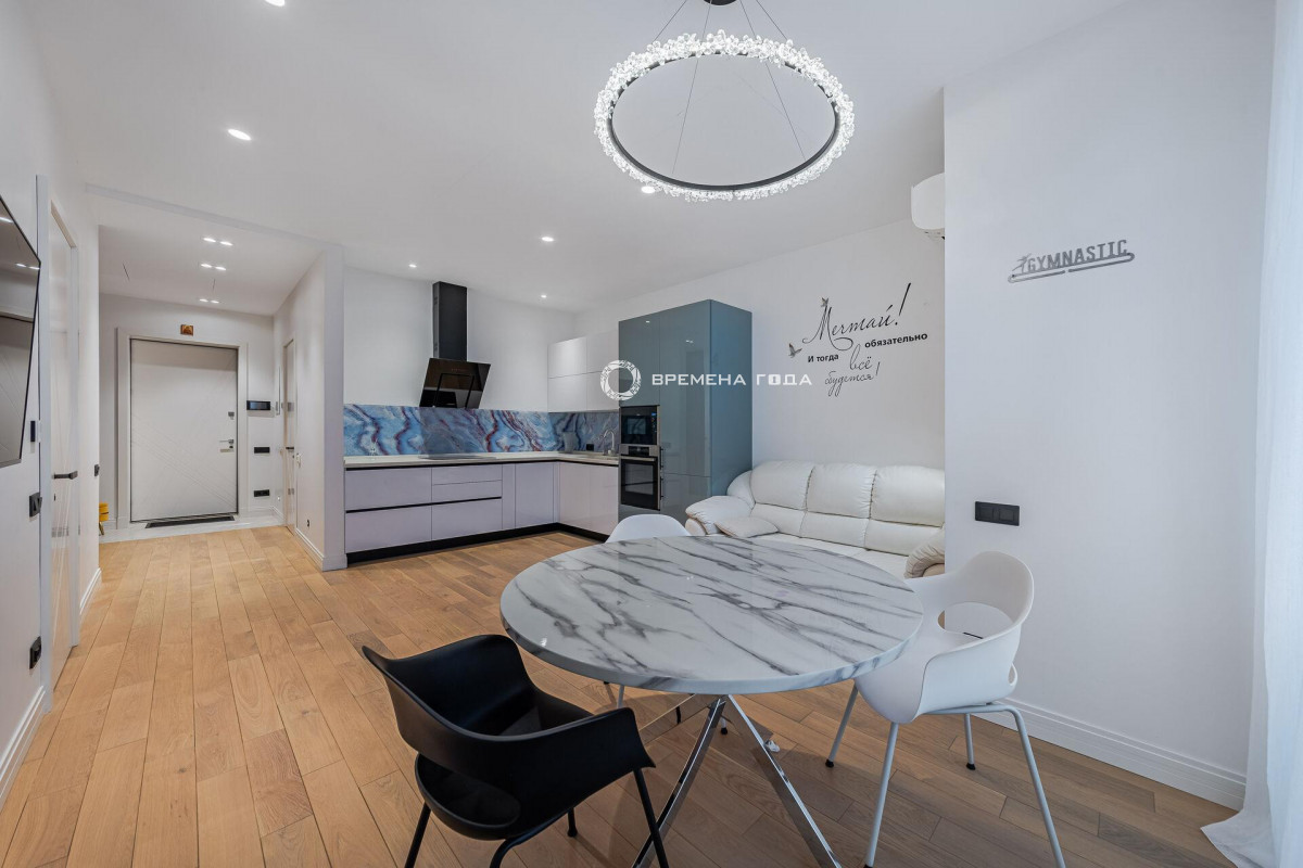 Планировочное решение: кухня с обеденной зоной и гостиной, изолированная спальня, два санузла, прихожая