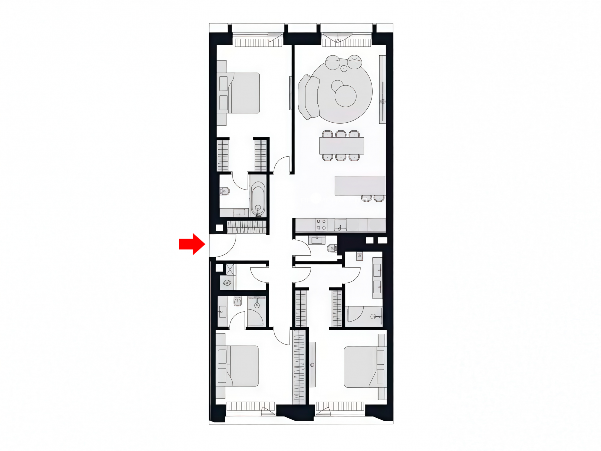 Планировочное решение: кухня с обеденной зоной и гостиной, две мастер-спальни со своими санузлами и гардеробными, спальня со своим санузлом, гостевой санузел, прихожая.