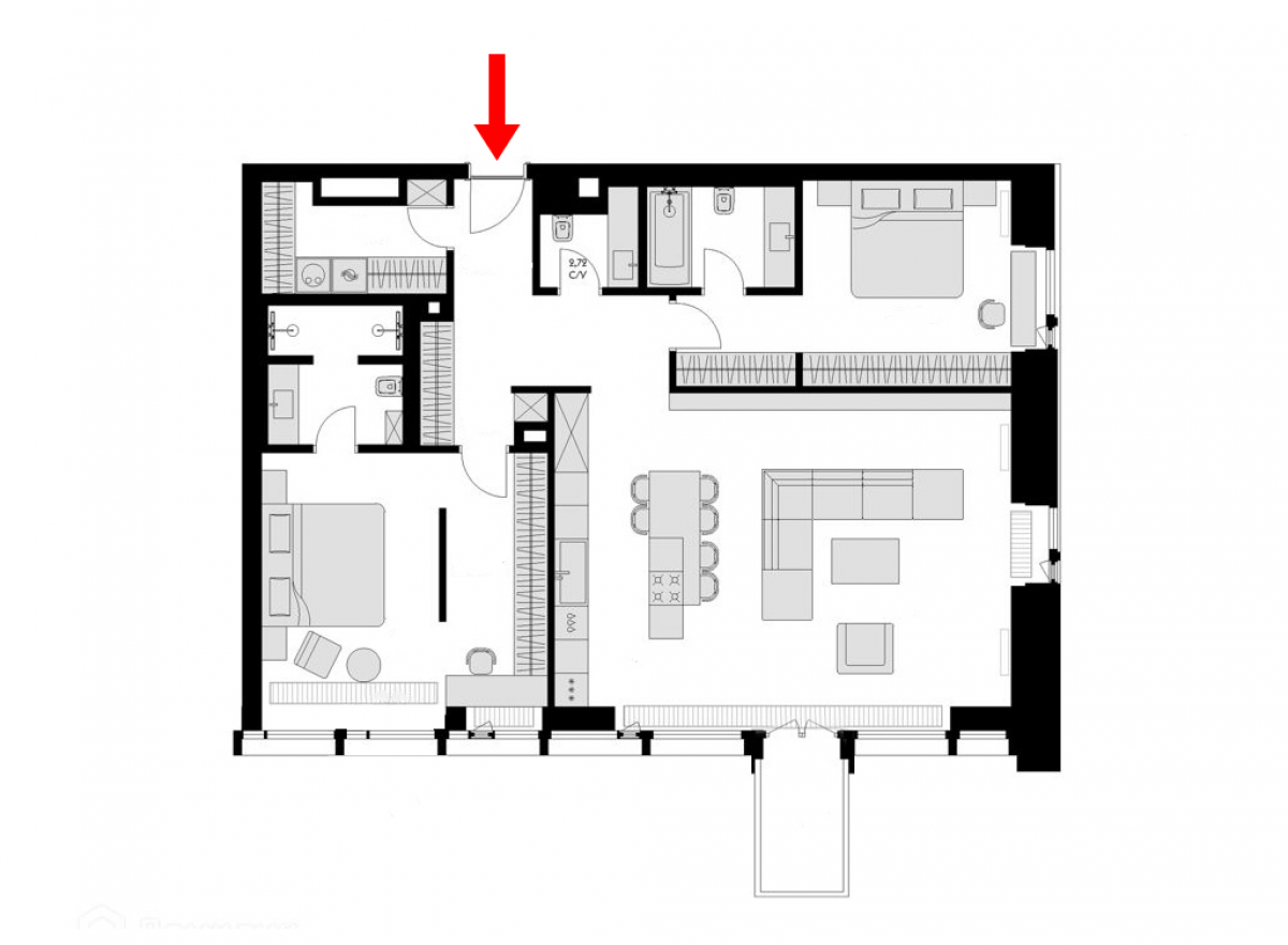 Планировочное решение: кухня с обеденной зоной и гостиной, две мастер спальни со своими санузлами и гардеробными, гостевой санузел, гардеробная, прихожая.