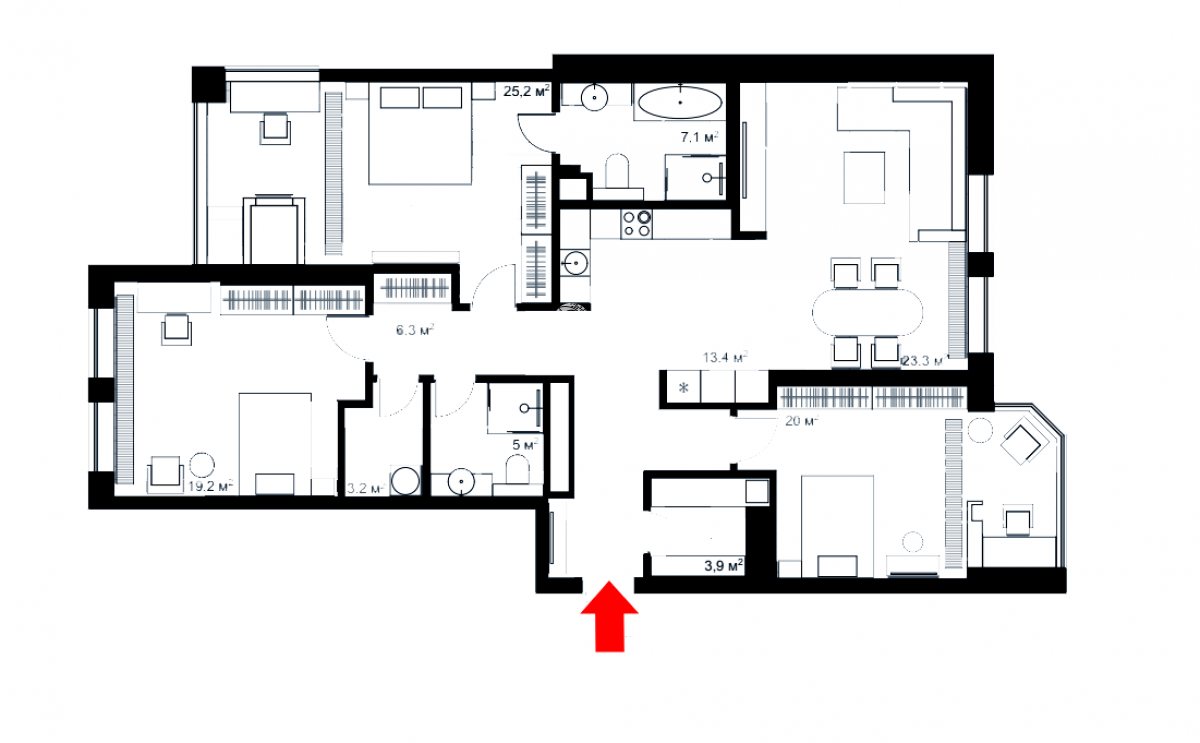 Планировочное решение: кухня с обеденной зоной и гостиной, спальня со своим санузлом, две комнаты свободного назначения, санузел, постирочная, гардеробная.
