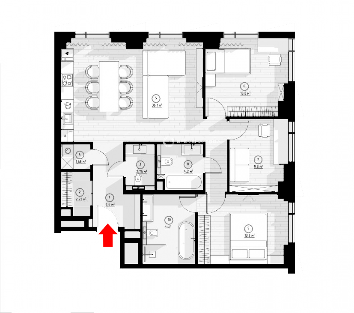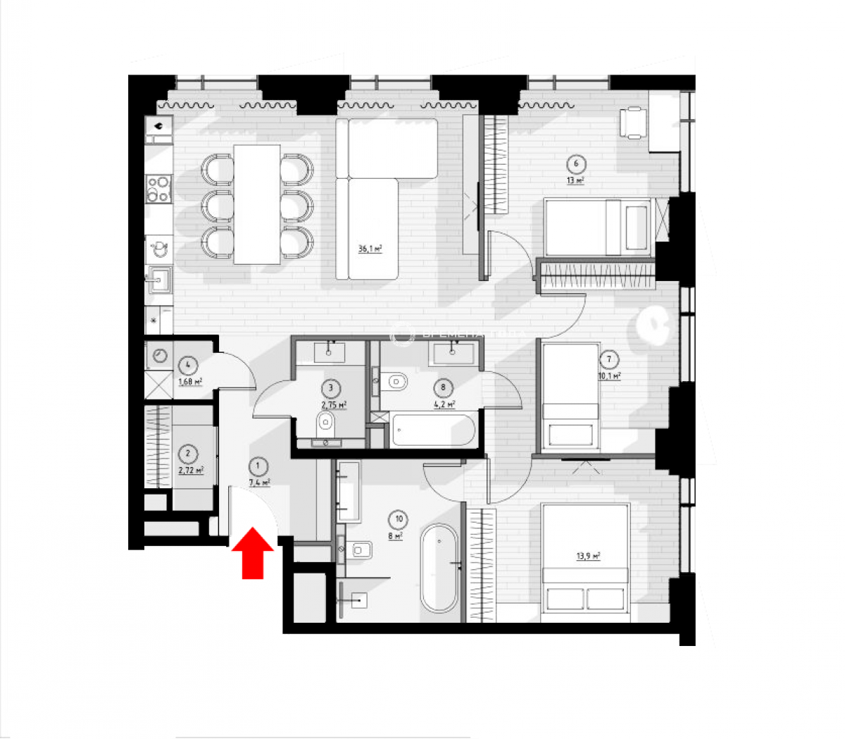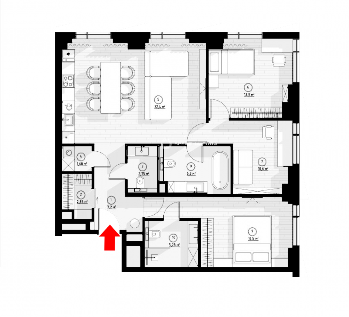 Планировочное решение: кухня с обеденной зоной и гостиной, мастер-спальня со своим санузлом и гардеробной, две изолированные спальни, два санузла, гардеробная комната, холл