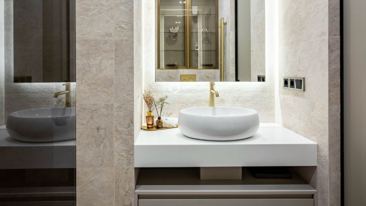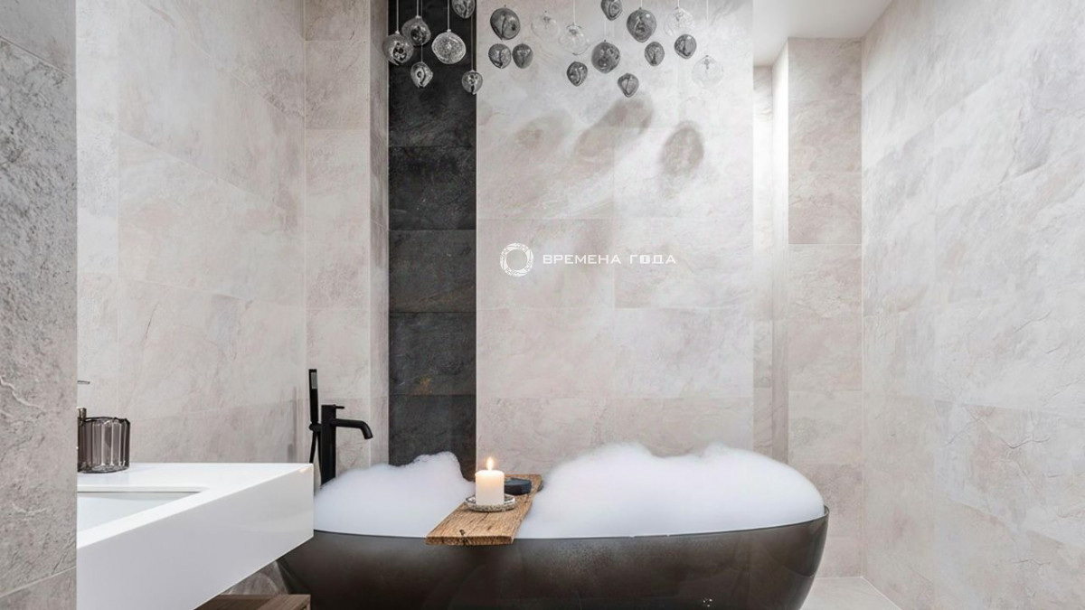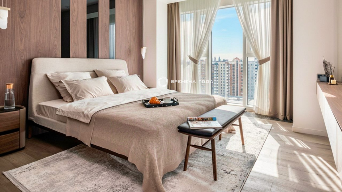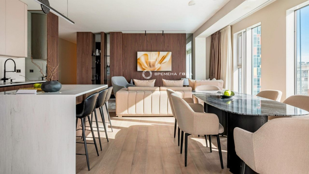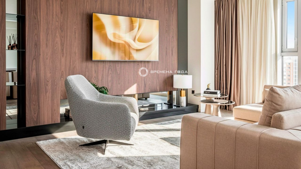 В отделке использованы натуральные материалы: дерево, дубовый шпон, инженерная доска. Установлена система индивидуального кондиционирования. Квартира укомплектована бытовой техникой и мебелью, изготовленной под заказ.