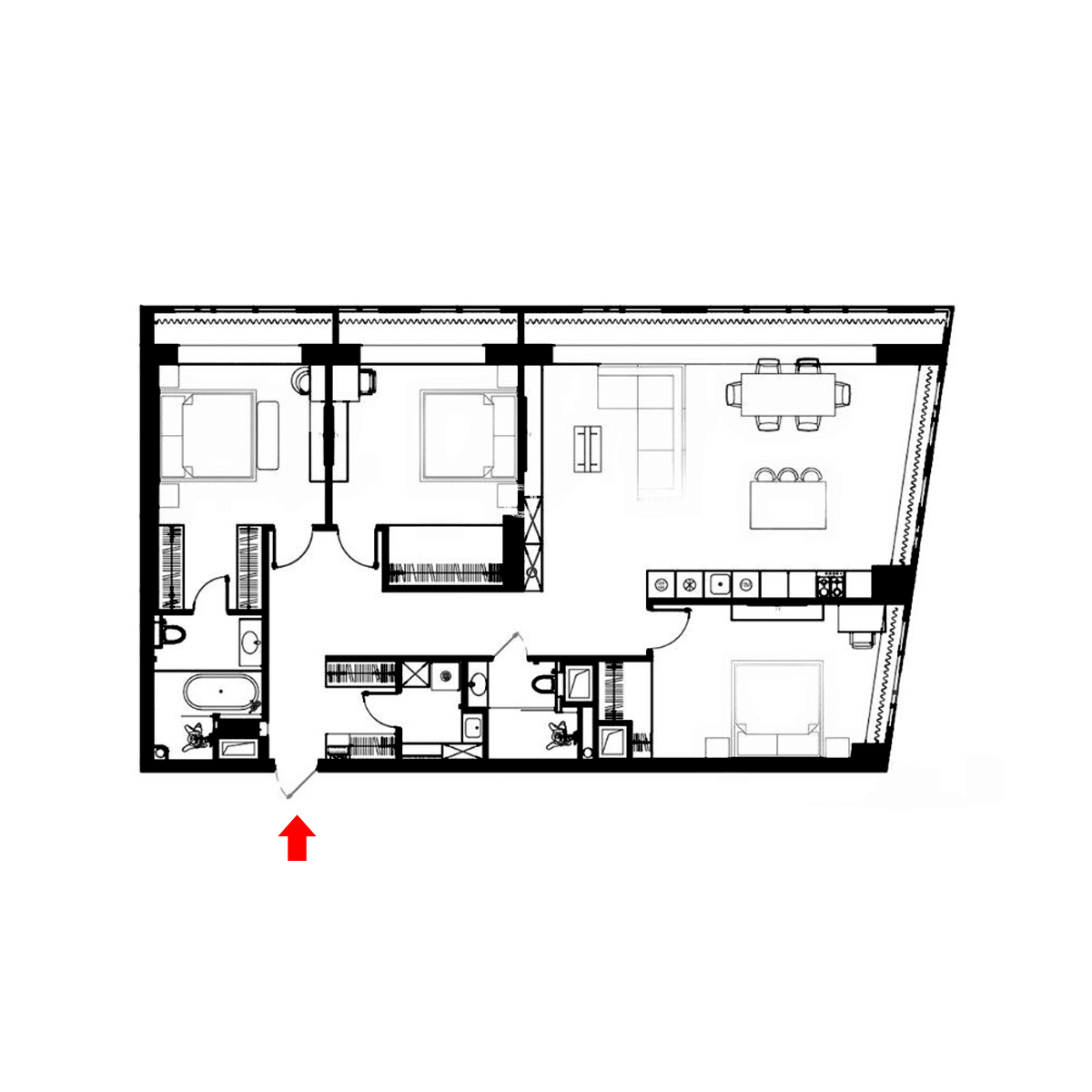 Планировка включает в себя просторную кухню-гостиную площадью с панорамным угловым остеклением во всю стену, мастер-спальню с собственной ванной комнатой и гардеробной, 2 спальни, санузел с душевой, постирочную, гардеробную и холл. Дополнительно предусмотрено много мест для хранения вещей.