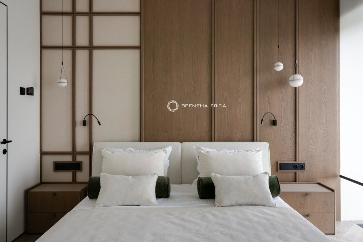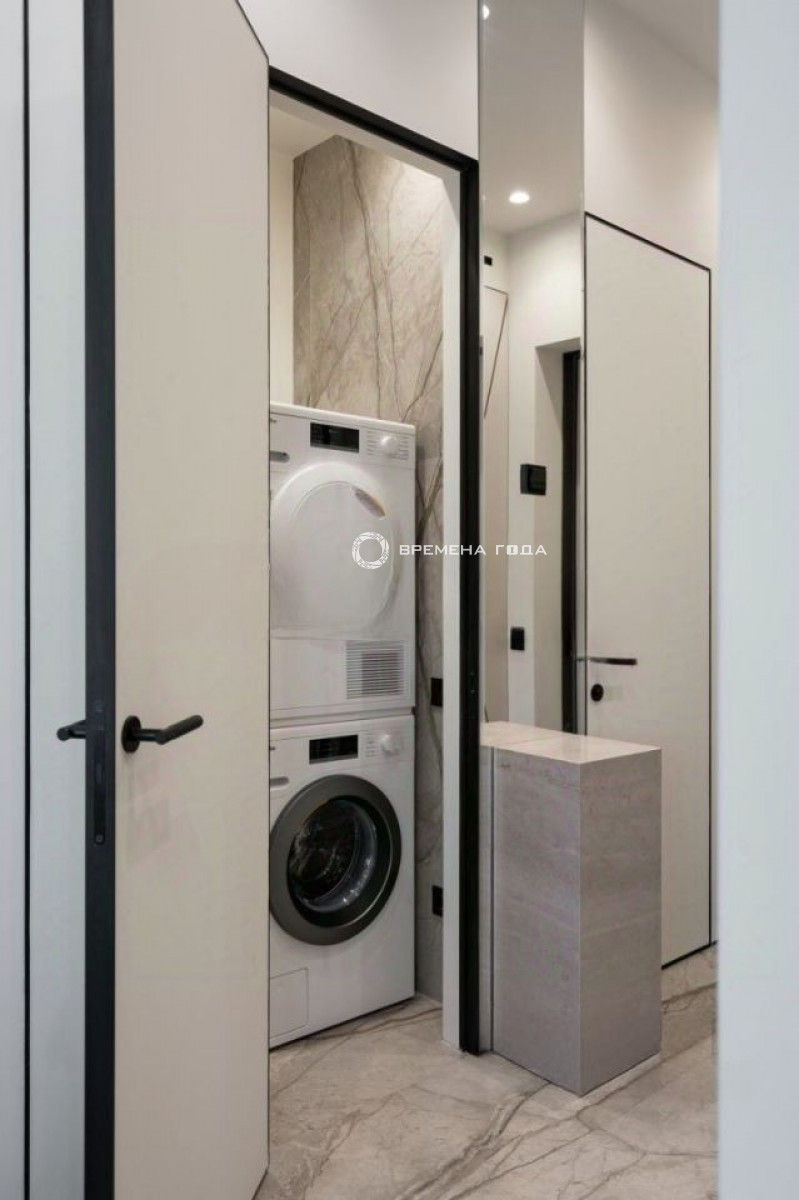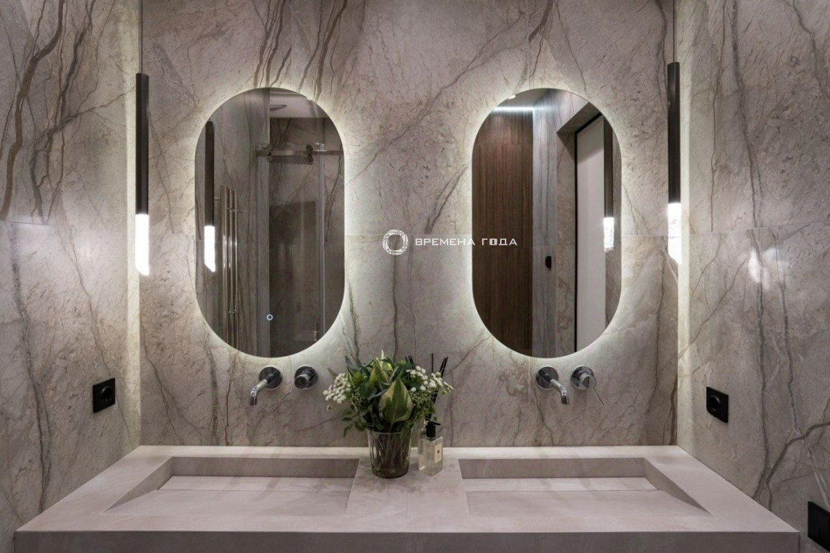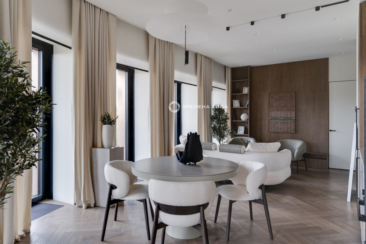 В отделке использованы премиальные материалы: шпон, широкоформатный керамогранит, инженерная доска, итальянская мебель, техника Miele.