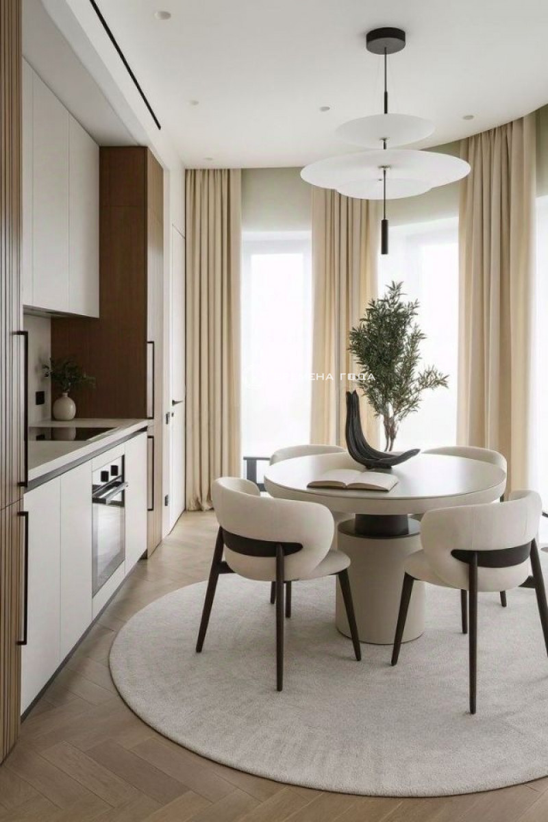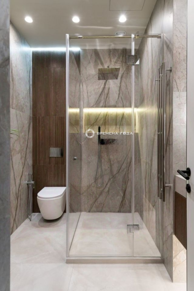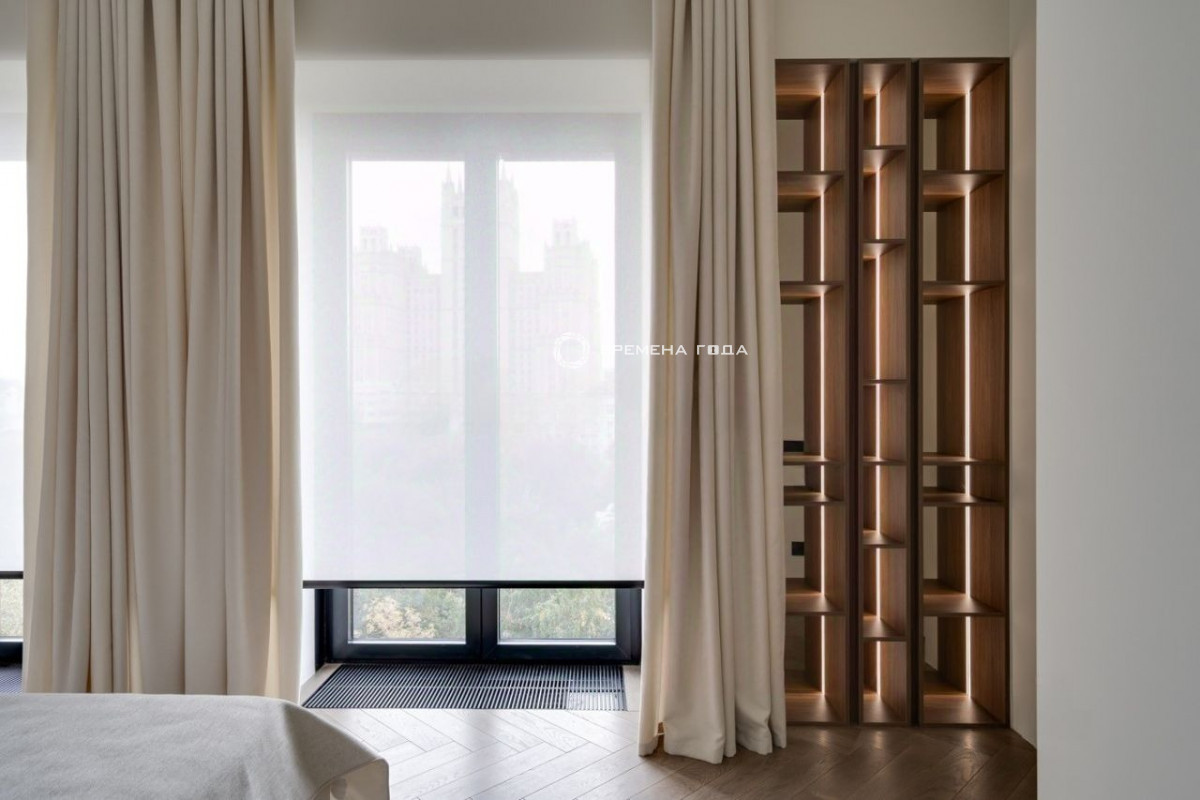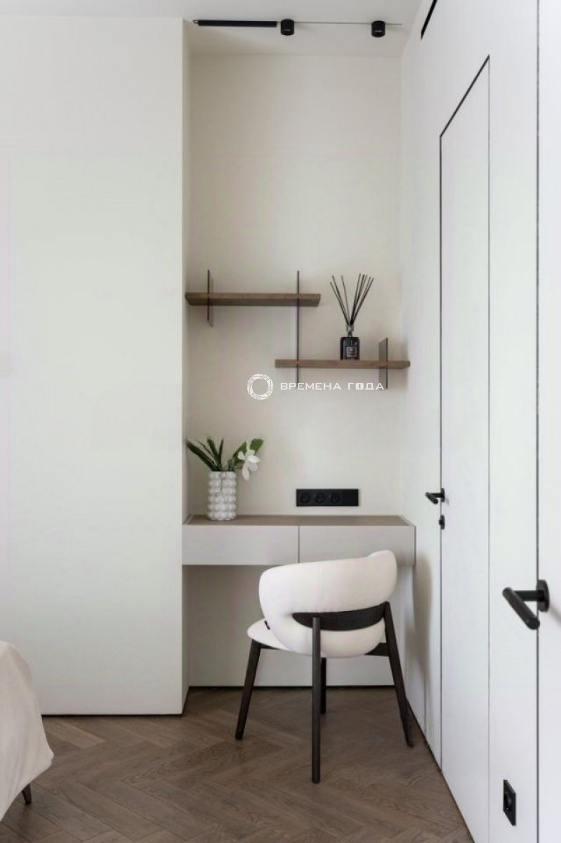 В отделке использованы премиальные материалы: шпон, широкоформатный керамогранит, инженерная доска, итальянская мебель, техника Miele.