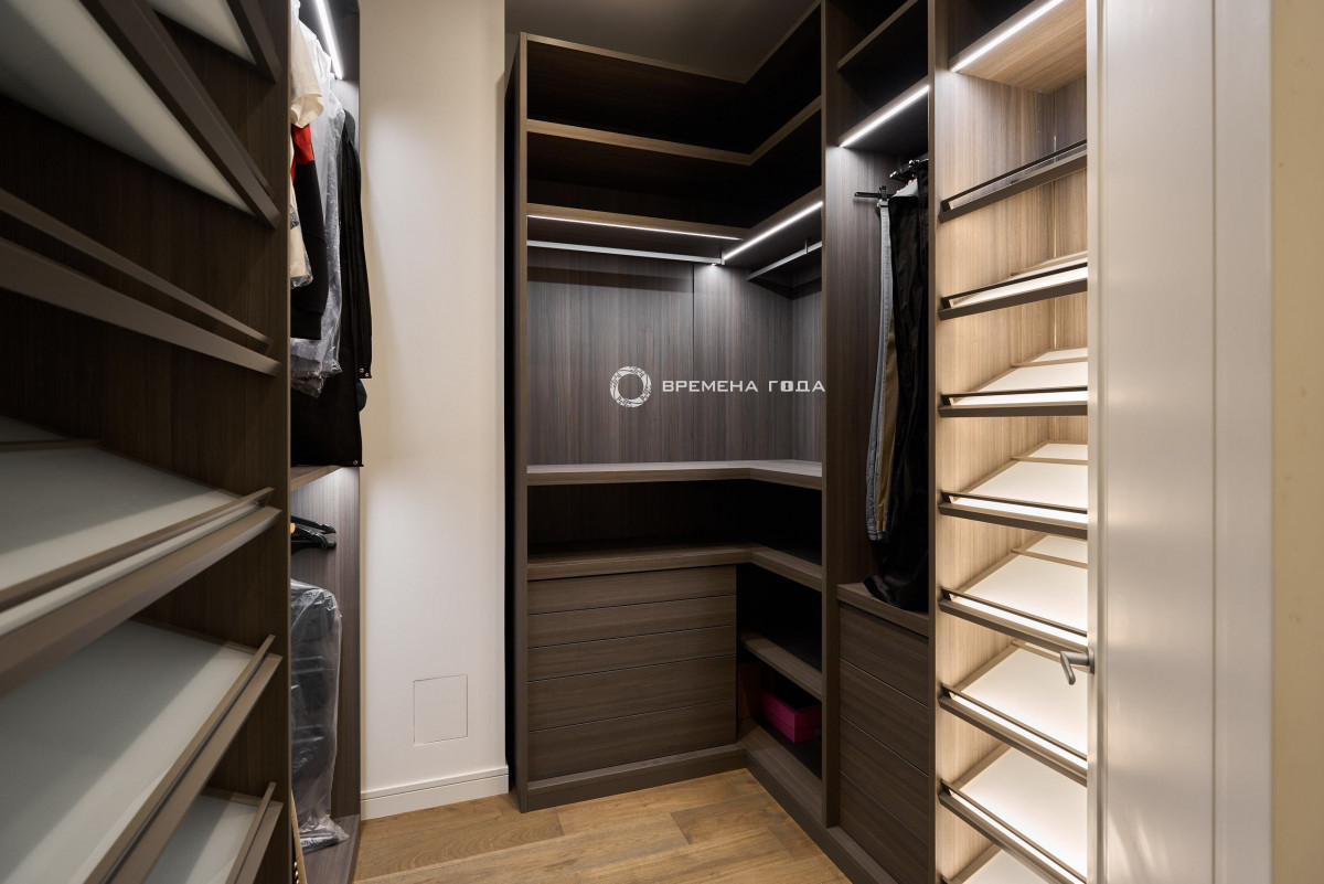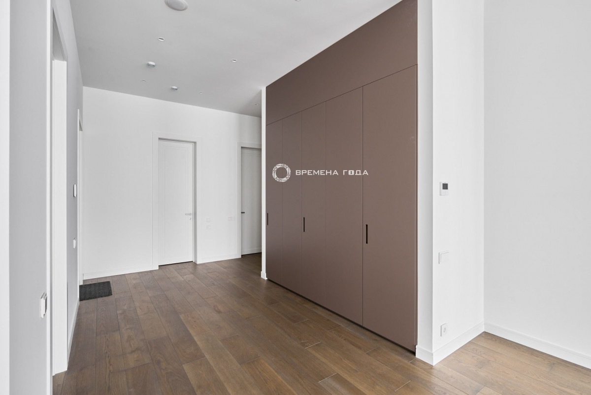 Планировочное решение: кухня с обеденной зоной и гостиной, три спальные комнаты, три санузла, три гардеробные комнаты, холл