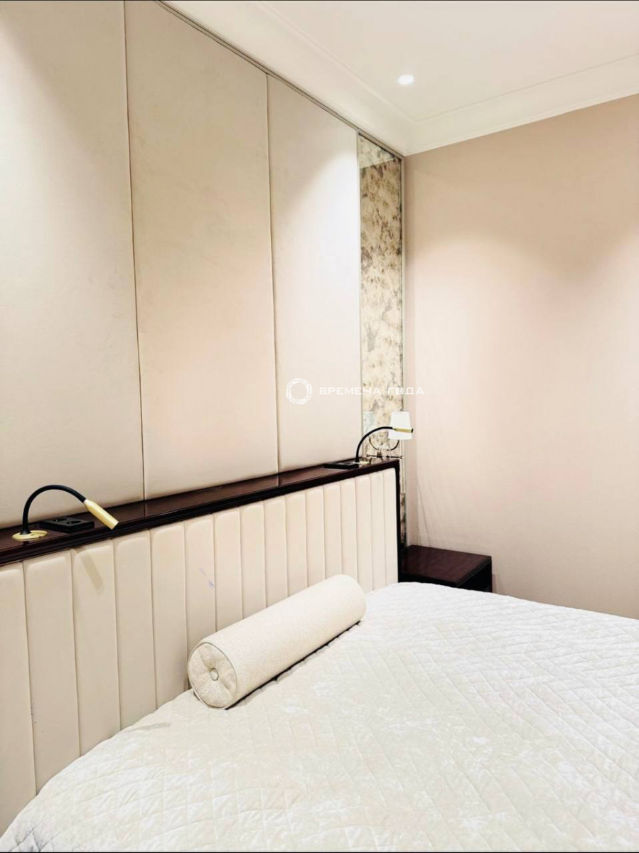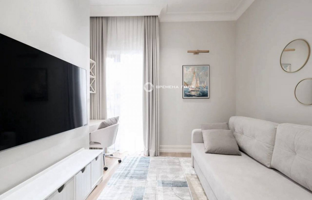 Планировочное решение: кухня с обеденной зоной и гостиной с выходом на балкон, две спальни, два санузла, гардеробная комната, холл