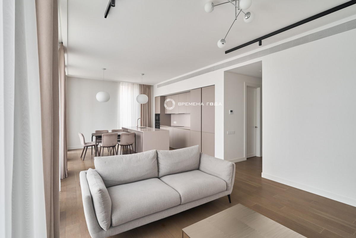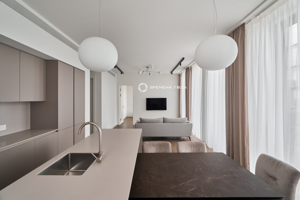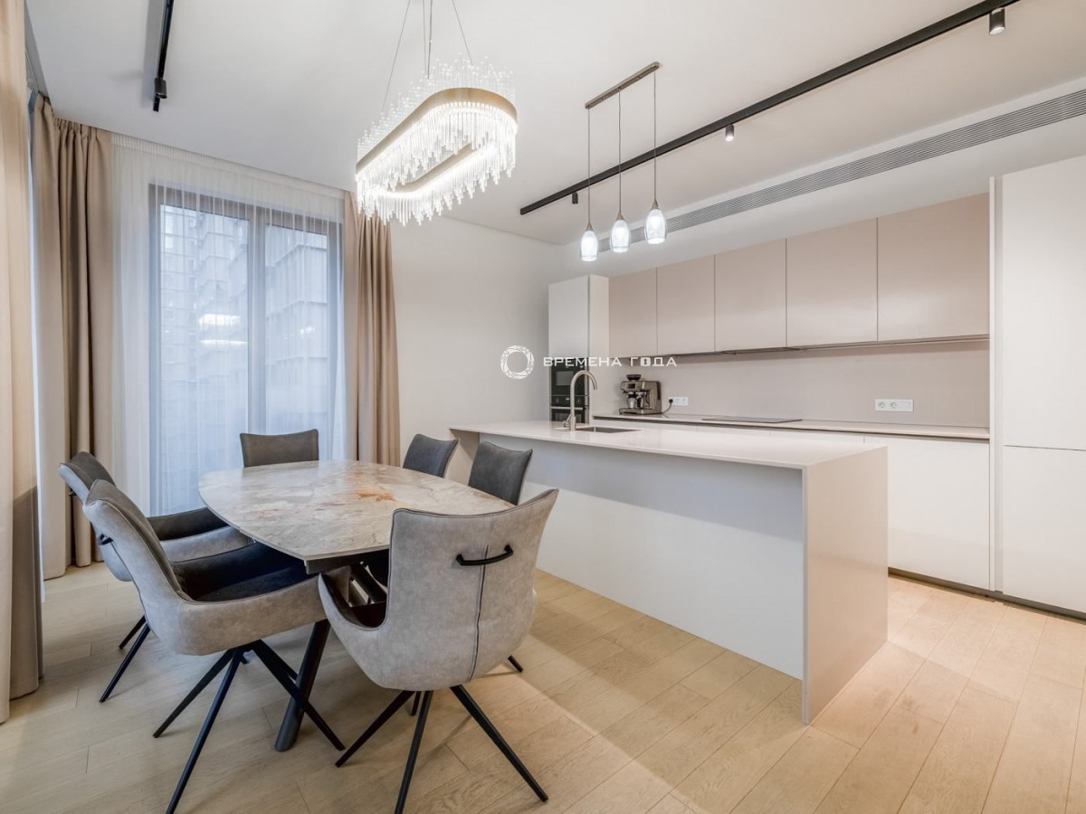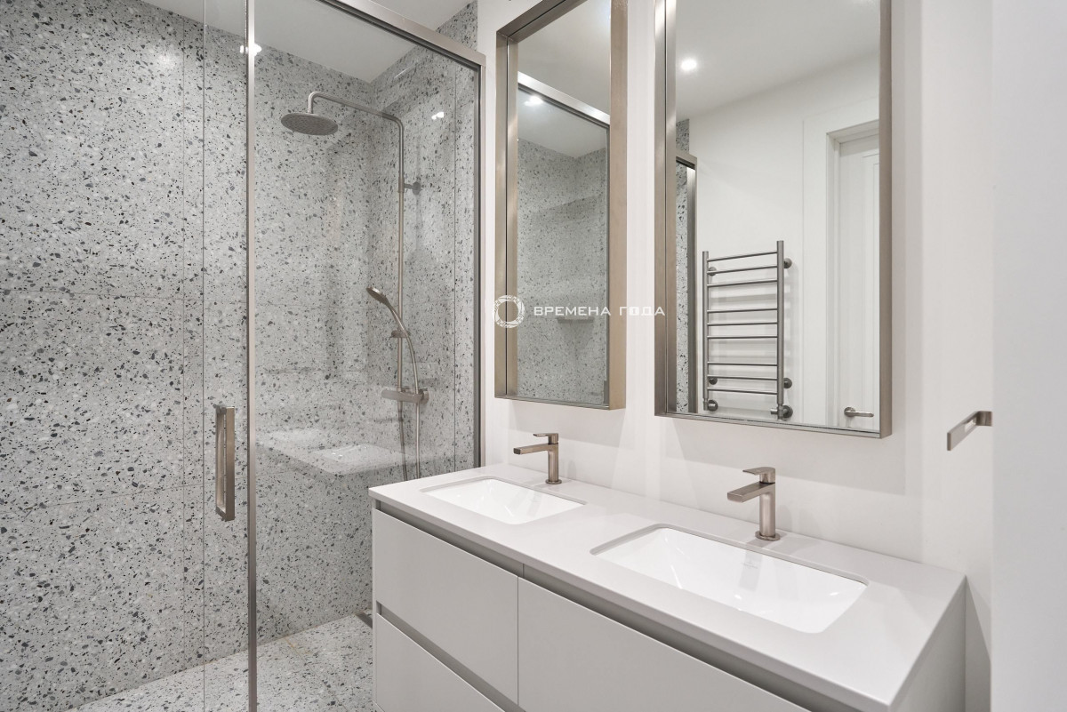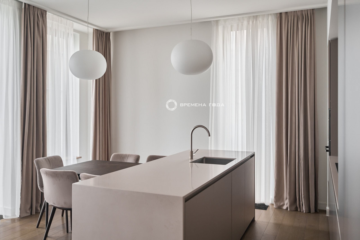 Установлена кухня итальянского бренда Dada. На полу деревянная паркетная доска с системой "тёплый пол". Санузлы облицованы керамогранитом и бетонной плиткой "Терраццо", установлена премиальная сантехника.