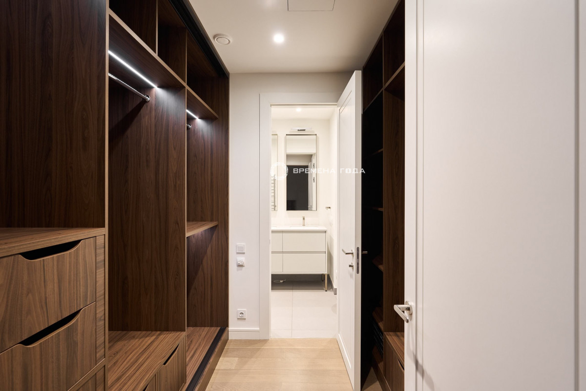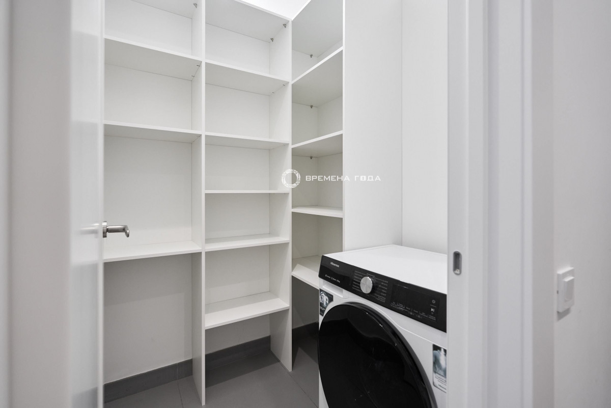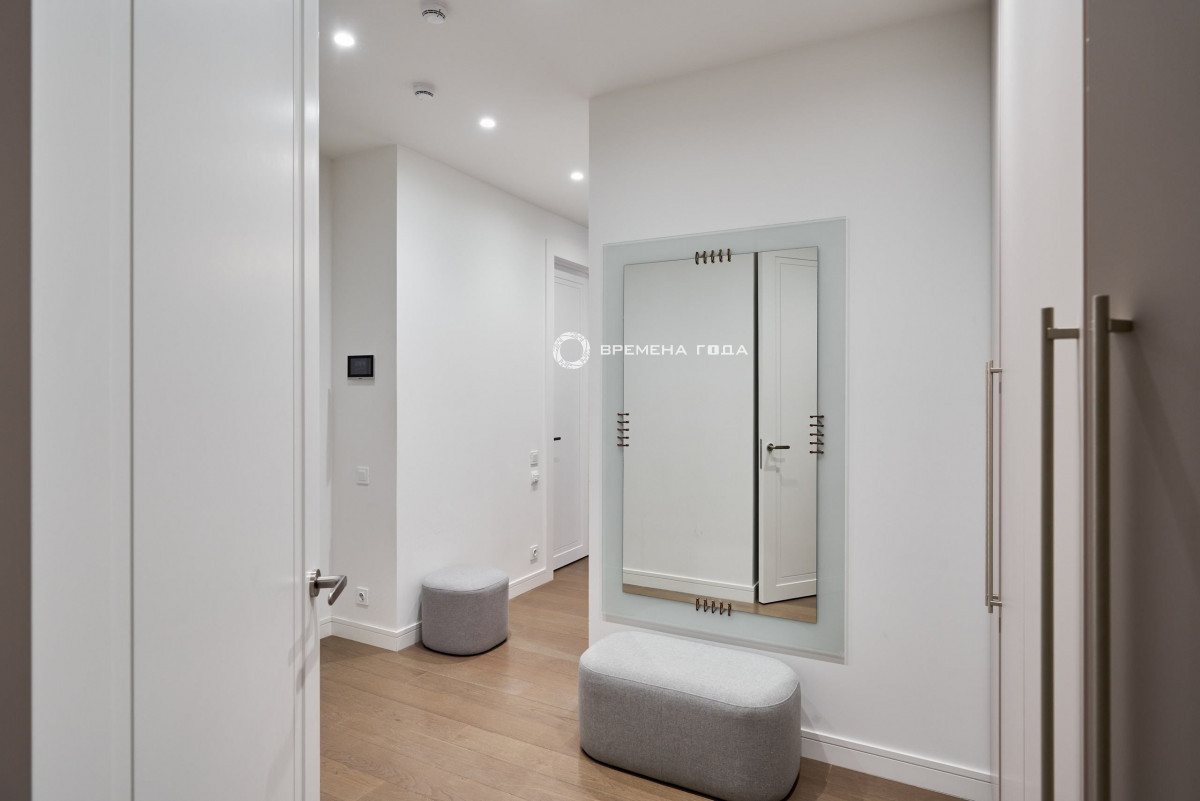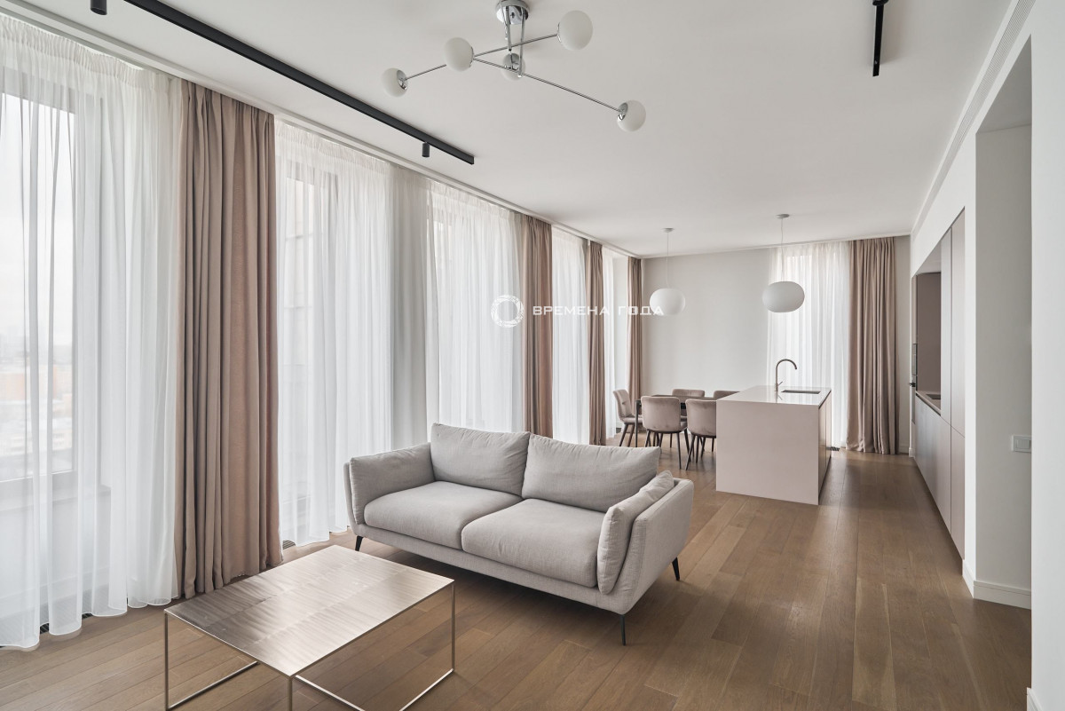 Установлена кухня итальянского бренда Dada. На полу деревянная паркетная доска с системой "тёплый пол". Санузлы облицованы керамогранитом и бетонной плиткой "Терраццо", установлена премиальная сантехника.