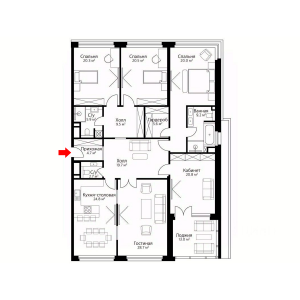 Планировочное решение: кухня с обеденной зоной и гостиной, две спальни со своим санузлом каждая, гостевой санузел, две гардеробные комнаты, прихожая