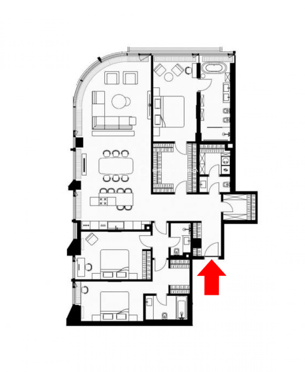 Планировочное решение: кухня с обеденной зоной и гостиной, две мастер-спальни со своими санузлами и гардеробными комнатами, изолированная спальня, два санузла, гардеробная и постирочная комнаты, прихожая