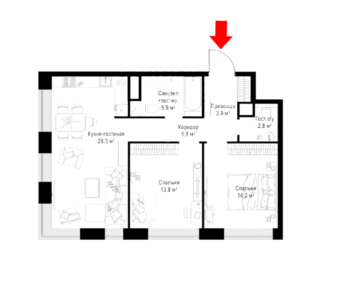 Возможный вариант планировки: кухня с обеденной зоной и гостиной, две изолированные спальни, два санузла, один из которых с постирочной зоной, прихожая