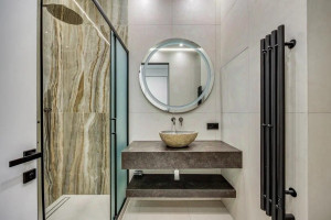 Возможный вариант планировки: кухня с обеденной зоной и гостиной, мастер-спальня со своим санузлом и гардеробной комнатой, гостевой санузел, постирочная, холл.